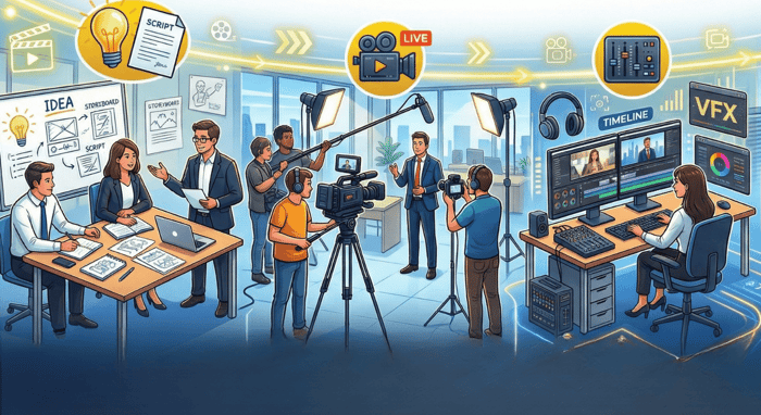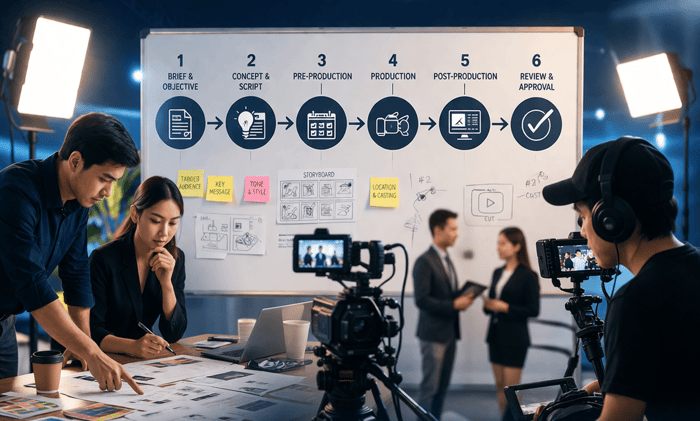 กว่าจะมาเป็น Corporate Video หนึ่งชิ้น ต้องผ่านมากกว่าการถ่ายทำ แต่เป็นกระบวนการที่เริ่มจากการเข้าใจธุรกิจ วางเป้าหมาย คิดโครงเรื่อง เตรียมงาน ถ่ายทำ และตัดต่ออย่างเป็นระบบ